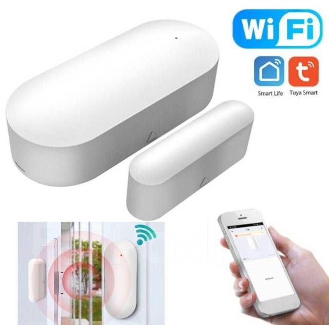 Беспроводной магнитный датчик определяет, были ли открыта дверь, окно, ящик и т. д. Используется в паре с приложением на смартфоне. Когда приложение находится в режиме охраны, в случае открытия двери либо окна, беспроводной дверной магнитный датчик отправляет сигнал тревоги по сети Wi-Fi на ваше устройство.