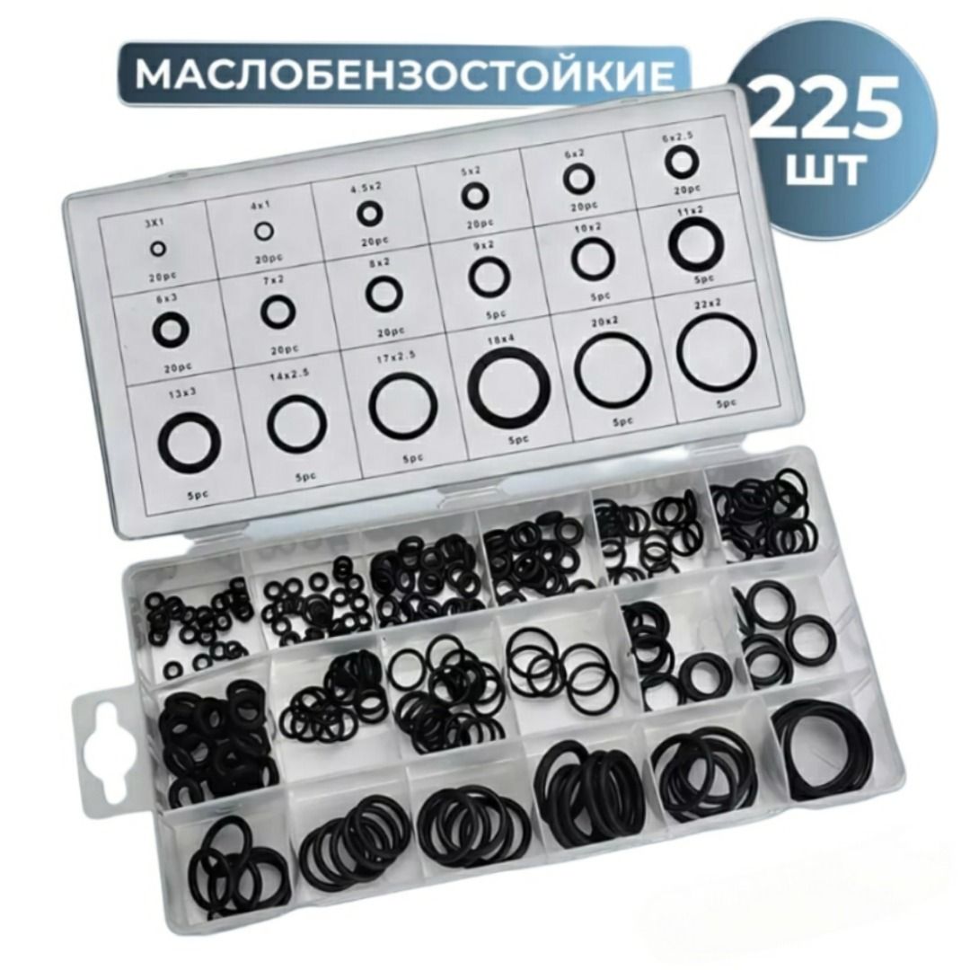 Набор включает 225 уплотнительных колец различных размеров, что обеспечивает универсальность применения.