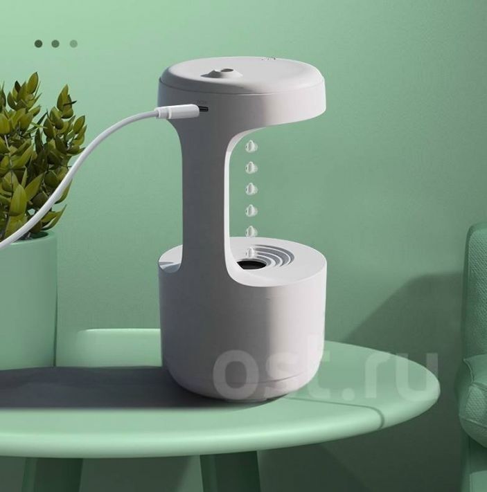 Почти все увлажнители — скучная коробка с отверстием для пара. Но, наш доступный гаджет, Вас точно удивит. Антигравитационный увлажнитель воздуха. Еще его называют левитационным. В нем видно, как капли медленно капают вверх, что противоречит законам земного притяжения. На самом деле вода течет вниз. Увлажнитель оснащен специальной лампой, которая под определенной частотой подсвечивает определенный участок струи. Из-за этого кажется, будто капли текут вниз. Этот гаджет добавит уюта, создаст комфортную обстановку в доме. Увлажнитель для воздуха очень компактный и эргономичный, занимает мало места, легкий и компактный. Такой воздухоувлажнитель покорит Вас и Ваш дом своим дизайном и функциональностью. Мини увлажнитель можно разместить на рабочем столе, прикроватной тумбочке и оставить его на всю ночь. Полного бака жидкости хватит до 8 часов непрерывной работы . Гаджет может увлажнить до 30 кв. м. Воду необходимо добавлять фильтрованную или питьевую (от 0 до 25 градусов). Влажный воздух и тихое журчание капель воды способствует успокоению и гармонизации психики. Влажный воздух также благоприятно воздействует на кожу лица и продлевает молодость, облегчает дыхание, предотвращает пересыхание слизистой носа. Ваш сон санет крепче.
