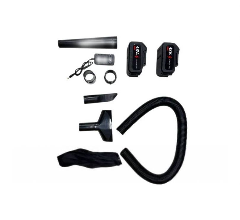 Комплектация: 2 аккумулятора; зарядное устройство; воздуходув; пылесборник; трубка; шланг; 2 насадки для пылесоса.