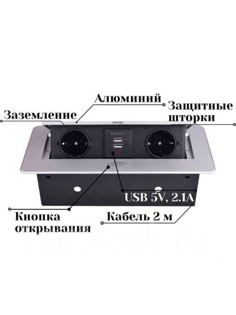 Выдвижная розетка для столешницы, стола и прочей мебели, горизонтальная, представляет собой металлический розеточный блок на 2 EURO розетки и 2 USB порта для зарядки.Габаритный размер 265x118x65 ммОтверстие 225х108 ммПри нажатии на кнопку на лицевой части выдвижной розетки, происходит плавное открытие. Данная модель готова к эксплуатации вся внутренняя разводка уже сделана на фабрике, .В комплект поставки к выдвижной розетке так же входит инструкция по установке изделия в столешницу, с подробной схемой и указанием всех размеров.Скрытые выдвижные удлинители с розетками отлично подходят для установки в столешницу на кухне, что помогает экономить рабочее пространство. В закрытом положении встраиваемая розетка образует со столешницей практически ровную поверхность. Также выдвижные розетки нашли распространение в офисах, переговорный залах, стойках обслуживания клиентов.